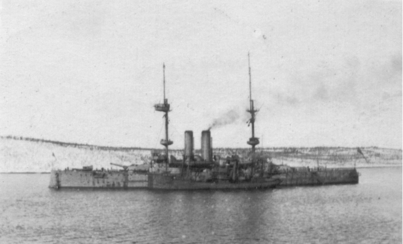 The cruiser HMS Glory at Murmansk, with a lighter alongside.